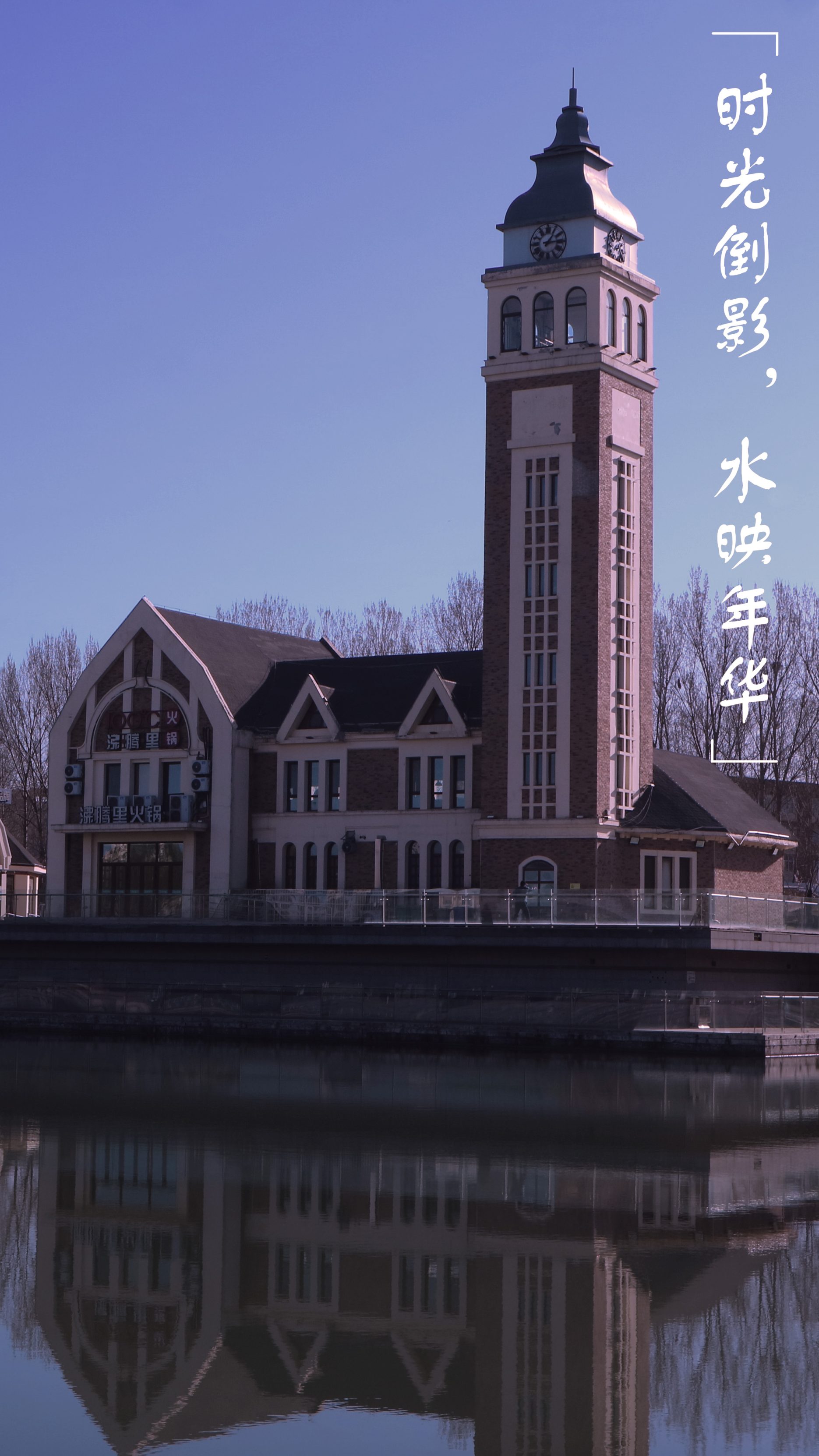 这张图片展示了一座具有欧式风格的钟楼建筑,钟楼高耸,顶部是尖顶,下方有一个圆形的钟面。钟楼下方是一栋两层的建筑,建筑风格典雅,外墙为红砖色,搭配白色装饰线条,显得庄重而古朴。建筑前方有一片平静的水面,倒映出建筑的影子,形成了一幅对称的画面,增添了画面的美感和宁静氛围。图片右侧有中文文字 “时光倒影,水映年华”,寓意着时间的流逝和岁月的沉淀,仿佛这座建筑见证了历史的变迁,而水面的倒影则象征着回忆与过往的时光。